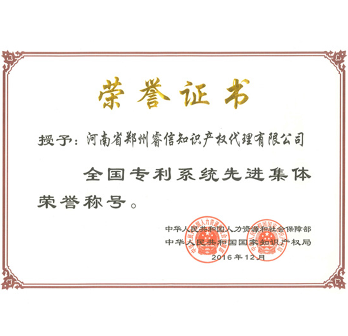 由人力資源和社會保障部、國家知識產權局聯合舉辦的全國專利系統先進集體和先進個人評選中,公司榮獲“全國專利系統先進集體榮譽稱號”。